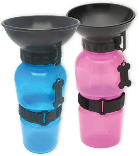 Bebedero de viaje, fácil de usar, aprieta suavemente la botella y el agua llenará el recipiente. Suelta tu apretón y el agua regresa a la botella.