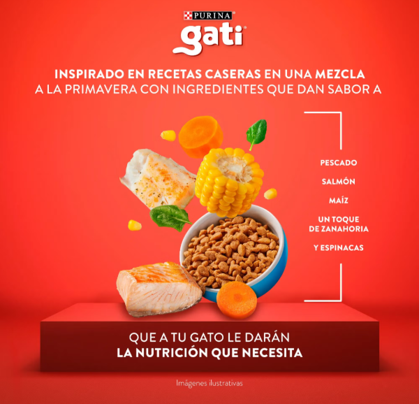 Inspirado en recetas caseras en una mezcla a la primavera con ingredientes que dan el sabor a pescado, salmón, maíz y un toque de zanahoria y espinaca que a tu gato le dará la nutrición que necesita.