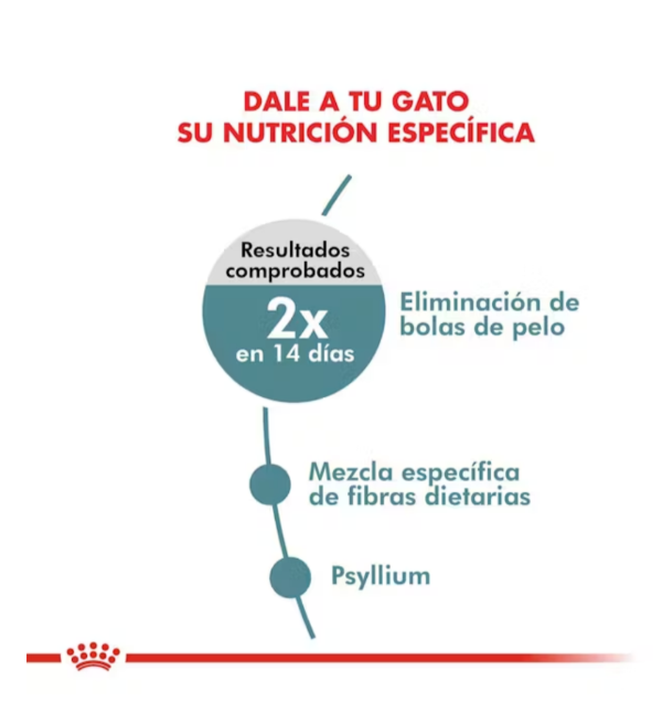 Es una fórmula nutricional específicamente balanceada que ayuda a reducir la formación de bolas de pelo. El exclusivo complejo Hairball Care está compuesto por una mezcla específica de fibras dietarias, que incluyen el psyllium(rico en mucílagos) y fibras insolubles que ayudan a estimular el tránsito intestinal de manera natural. Así, el pelo que diariamente el gato ingiere al acicalarse puede eliminarse a través de las heces en lugar de acumularse en el estómago y luego ser regurgitadas.