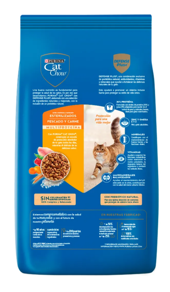 Defense Plus®, una combinación exclusiva de prebiótico natural, antioxidantes, vitaminas, y minerales que ayudan a fortalecer las defensas naturales de tu gato. Esto ayudará a promover un sistema inmune fuerte para proteger su estilo de vida único.