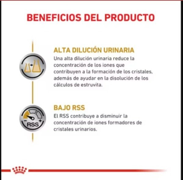 Alimento para gatos adultos, formulado para promover una alta dilución urinaria, ayudando a la disolución de cálculos de estruvita. Contribuye al manejo nutricional de los cálculos de oxalato de calcio y de estruvita, reduciendo su recurrencia mediante el uso único de esta dieta.