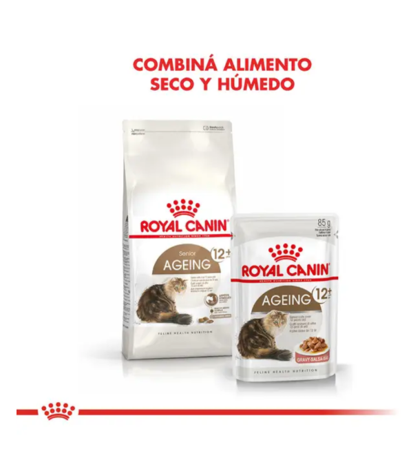 Royal Canin Ageing 12+ contribuye a la estimulación del apetito de los gatos gerontes, a dar soporte al organismo frente a los signos del envejecimiento, y a preservar la función renal.