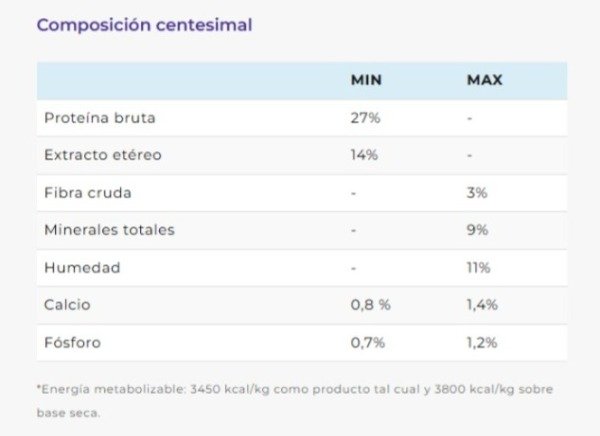 Harina de pollo, trigo, harina de carne, arroz, aceite de pollo, harina de soja micronizada, gluten meal, maíz, pulpa de remolacha (fuente de fructooligosacáridos FOS), hidrolizado proteico de pollo, aceite de pescado, levadura de cerveza, zeolita, sal, vitaminas A, D3, E, K3, B1, B2, B6, B12, biotina, ácido fólico, ácido nicotínico, ácido pantoténico, vitamina C, minerales inorgánicos (iodato de calcio, sulfato ferroso, óxido manganoso), minerales quelados (cobre como metioninato de cobre, selenio como levadura enriquecida, zinc como propionato de zinc), inulina, colina, extracto de Yucca schidigera, antioxidantes (extracto de romero, BHA, BHT) y polifenoles, sorbato de potasio, paredes de levadura (fuente de manano-oligosacáridos MOS), nucleótidos de levadura, hexametafosfato de sodio, metionina y lisina.