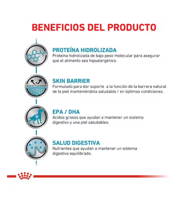 Proteína hidrolizada de bajo peso molecular para asegurar que el alimento sea hipoalergénico.