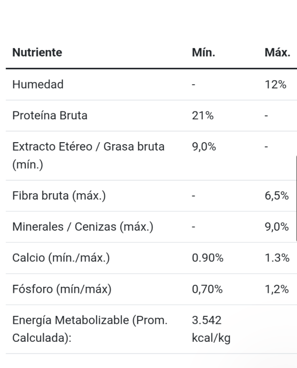 Maíz, arroz, gluten de maíz, harina de subproductos de pollo, fibra de soja y/o fibra de caña de azúcar, grasa vacuna y/o aceite de pollo preservados con tocoferoles (fuente de vitamina E), hidrolizado (líquido y/o en polvo) a base de subproductos de pollo y/o cerdo, sal, carbonato de calcio y/o fosfato de calcio, ácido fosfórico y/o bisulfato de sodio, cloruro de potasio y/o citrato de potasio, suplemento vitamínico antioxidante (A, D3, E, K3, B1, B2, B3, B5, B6, B7, B9, B12, BHT), sorbato de potasio, suplementos minerales [(sulfatos: zinc, hierro, manganeso, cobre), (proteinatos y/o glicinatos: zinc, hierro, manganeso, cobre, selenio), yodato de calcio, selenito de sodio], cloruro de colina, DL-metionina, L-lisina.