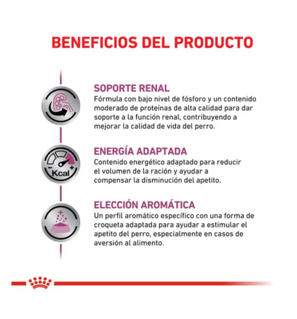 Alimento indicado para perros adultos formulado para ayudar a mantener la función renal en caso de insuficiencia renal crónica, a través de sus niveles restringidos de fósforo y proteínas de alta calidad.